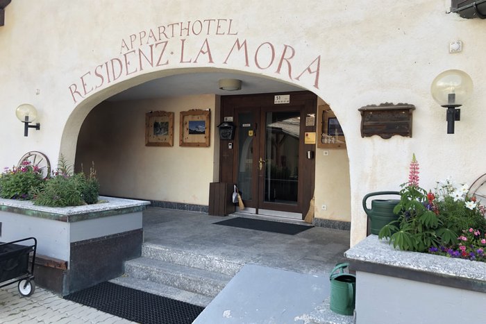 Rund um die Residenz La Mora gibt es viel Platz, Liegestühle und Sonnenschirme, um einen sonnigen Sommertag zu verbringen.